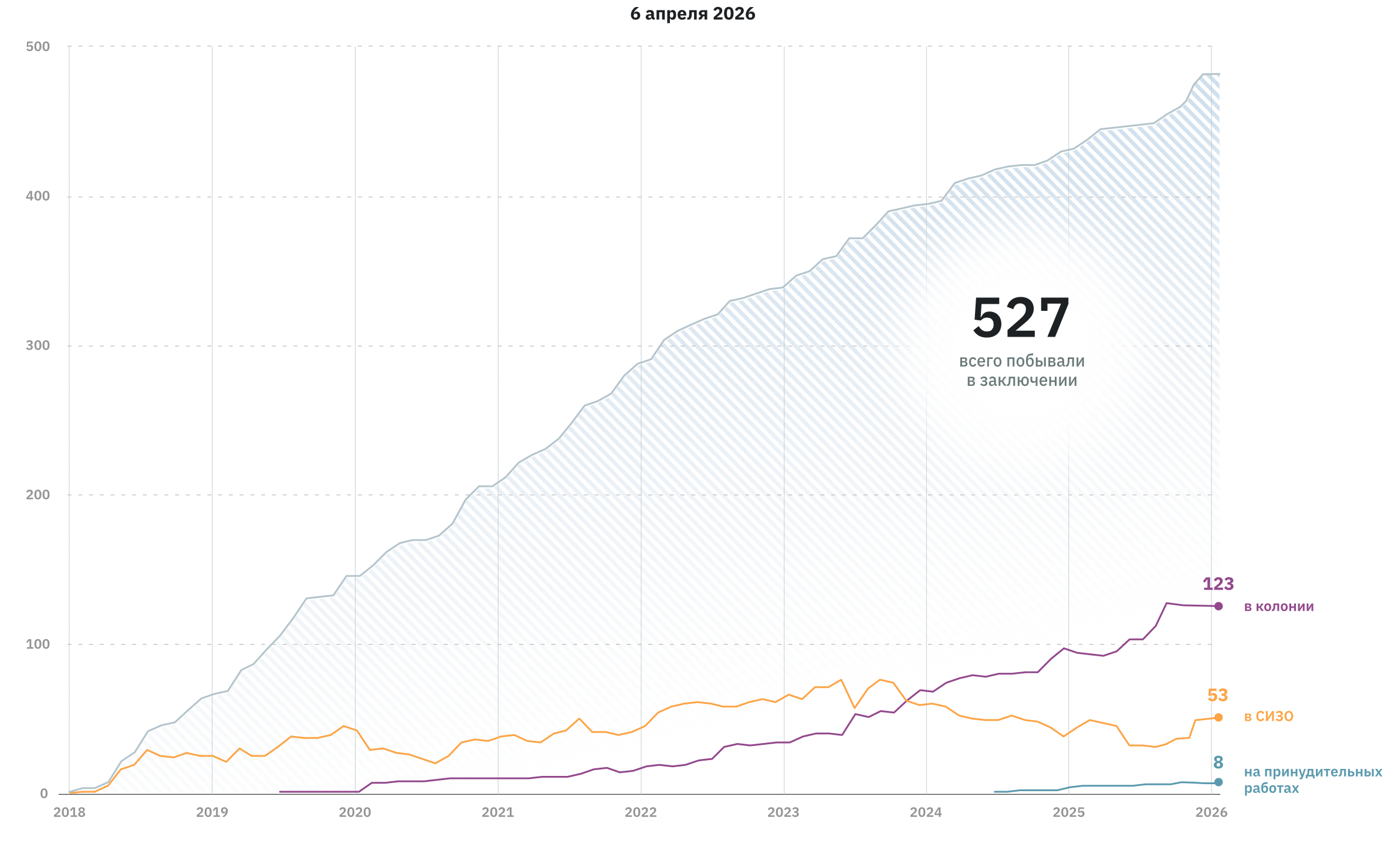 Очередная волна борьбы правоохранителей с запрещенной в России и признанной экстремистской организацией «Свидетели Иеговы» прокатилась по разным регионам. 10 февраля Абинский районный суд Краснодарского края приговорил к 7,5 годам колонии 63-летнего Александра Ившина. Столь длительный срок он получил за то, что посредством видеосвязи обсуждал со знакомыми Библию и учение иеговистов, а также исполнял религиозные песнопения. В эти же дни задержаны и обвинены в участии в экстремистской деятельности верующие в Москве, Биробиджане, Кызыле. Всего с 2017 года, когда организация была признана экстремистской и запрещена на территории РФ, преследованиям, в том числе уголовным, по данным правозащитников, подверглось более 220 человек.
