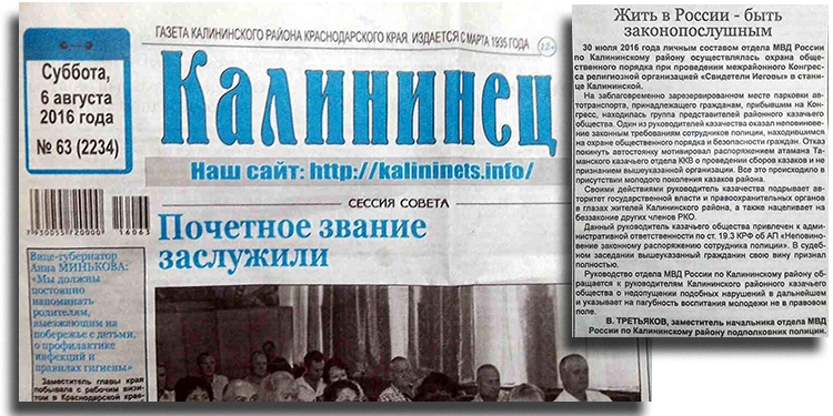 Krasnodar TerritoryOn July 30, 2016, in the village of Kalininskaya (Krasnodar Territory), police officers prevented the disruption of a major worship service attended by more than 1,600 Jehovah's Witnesses. The coordinated actions of the police were reported by the stanitsa newspaper.