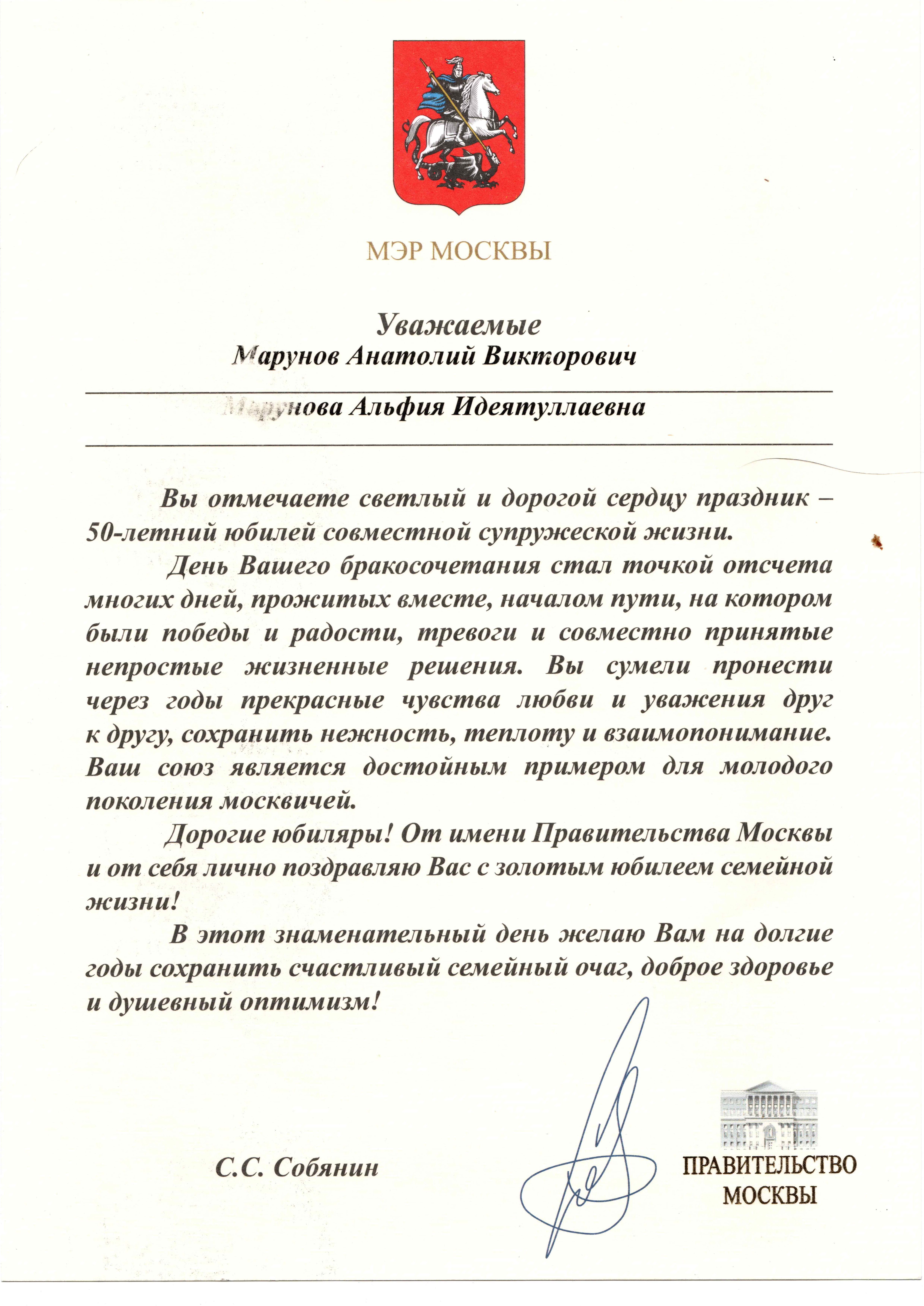 Onnittelukirje Marunovin perheelle heidän vuosipäivänsä johdosta Moskovan pormestarilta