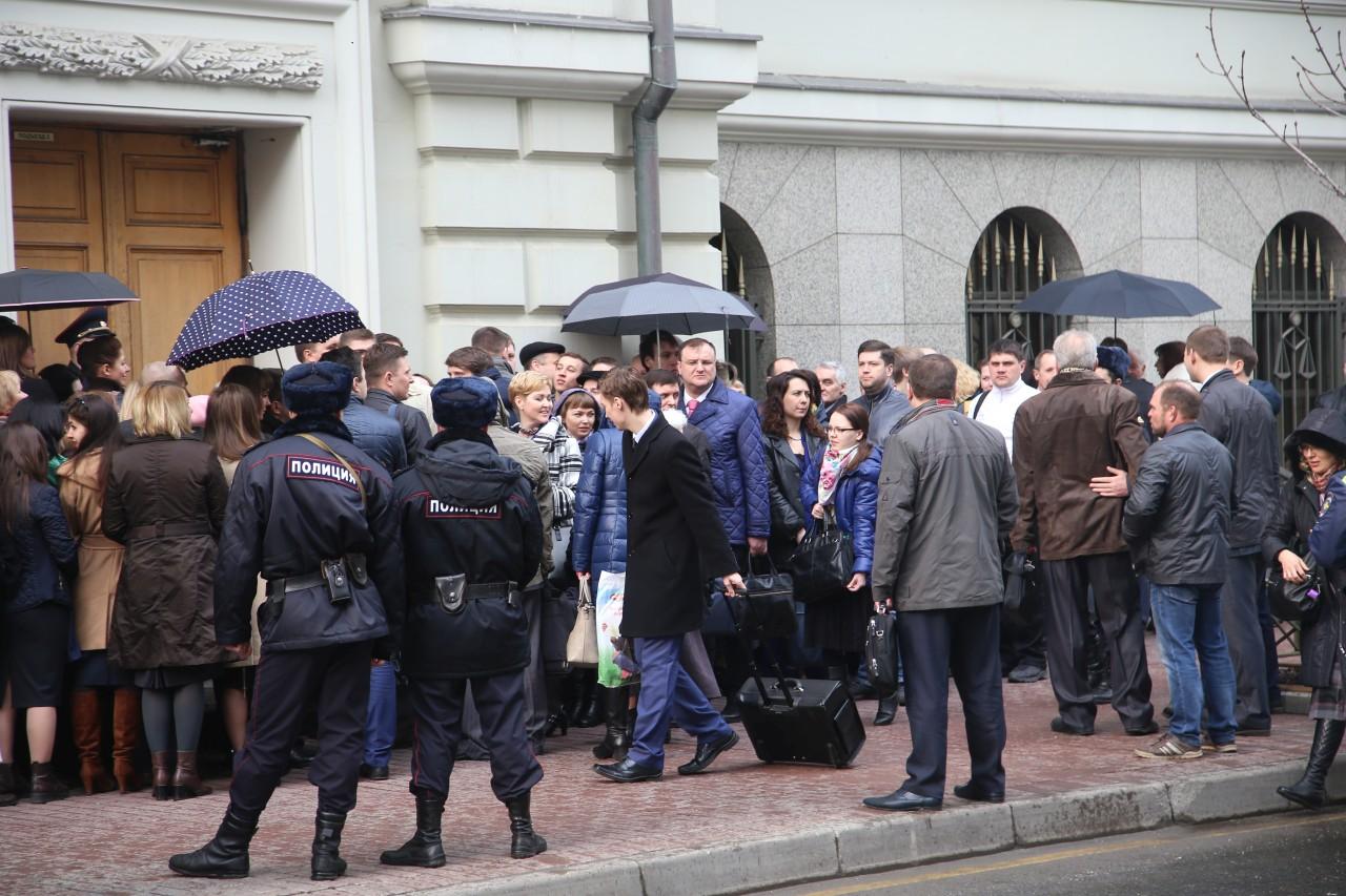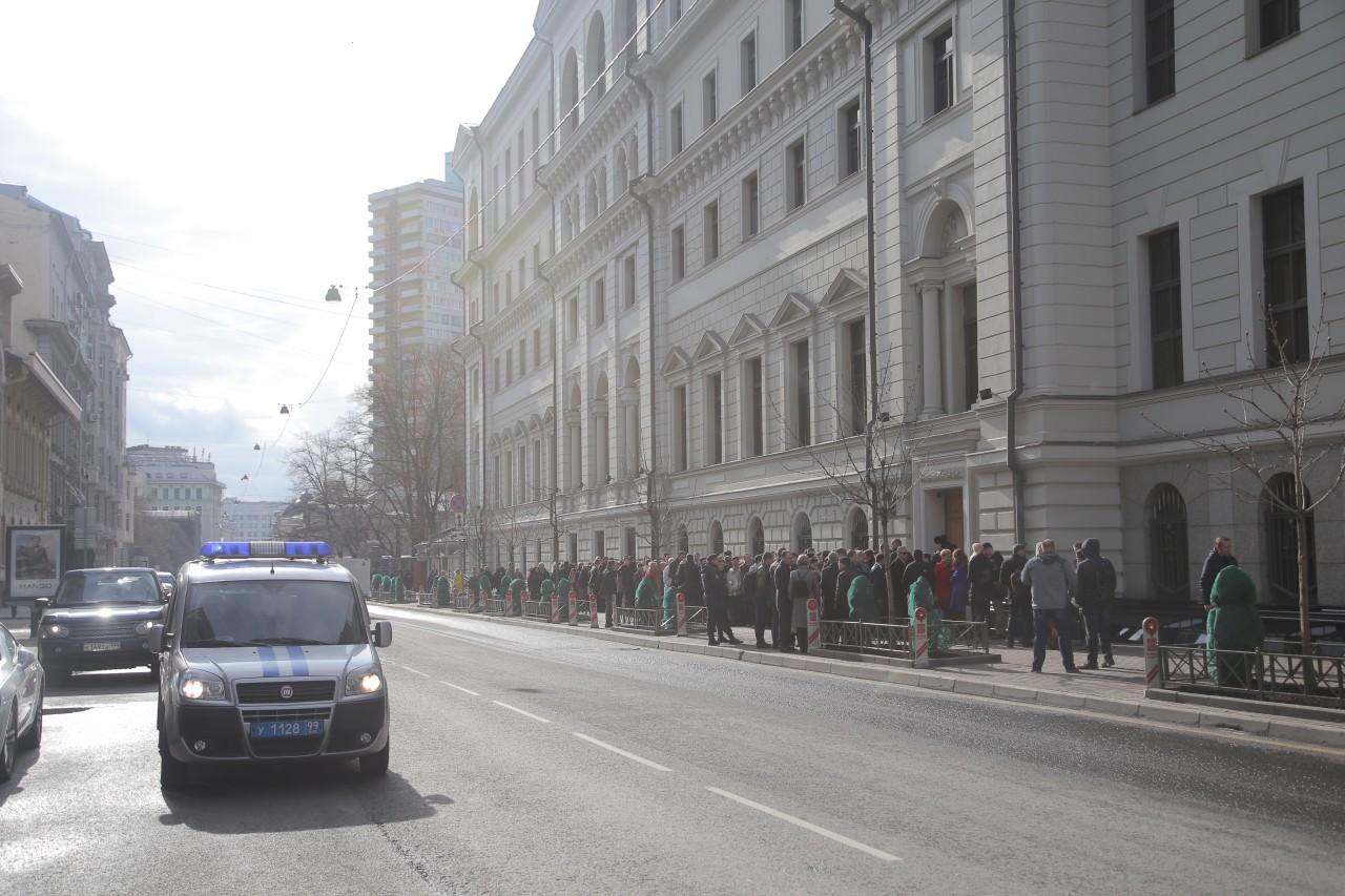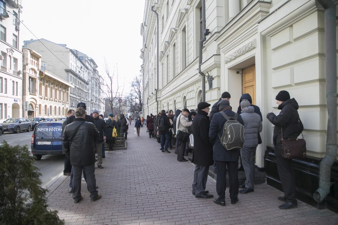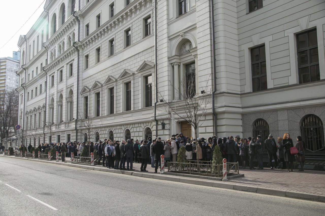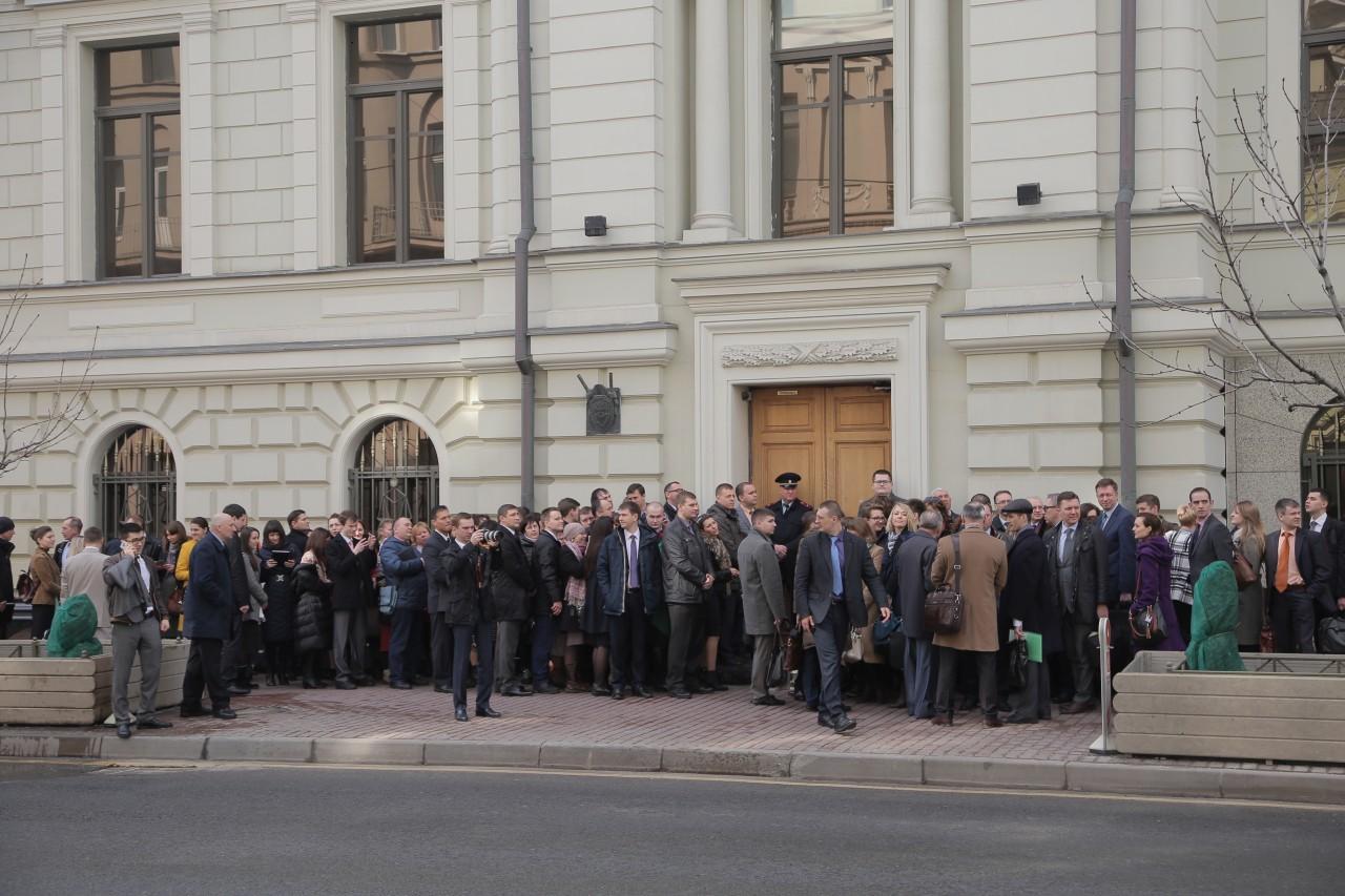 | 9:00 | La façade du bâtiment de la Cour suprême est plus bondée que jamais. La file d’attente a commencé à se former la nuit. Beaucoup spécialement venus de différentes villes de Russie. Comme il fait froid à Moscou, la plupart sont habillés en hiver. De temps en temps, quelqu’un apportait du café et des tartes pour ceux qui faisaient la queue. Personnel La police travaille de manière professionnelle et cohérente pour assurer la sécurité des personnes impliquées dans le procès.