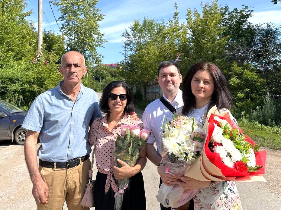左から右へ:ソナの父と姉、そして夫が、釈放後に彼女と一緒に写真を撮っている。2025年7月発売