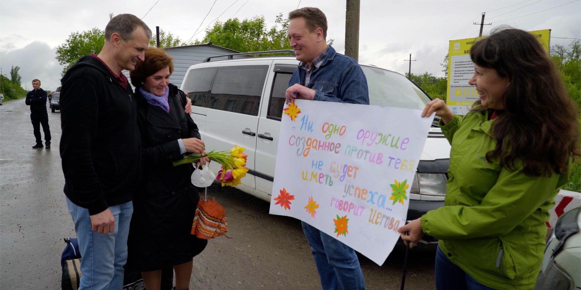아내와 동료 신자들은 러시아 국경 근처에서 콘스탄틴 바제노프를 만난다. 우크라이나, 2021년 5월 19일