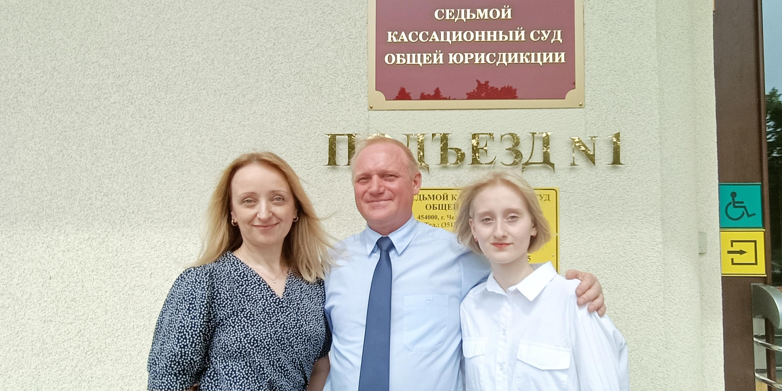 Павел Попов с женой и дочерью у здания Седьмого кассационного суда общей юрисдикции в Челябинске (май 2023)